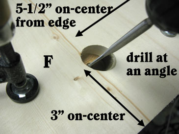 Step 3. Place part F on a block of wood the rabbeted side facing down and the rabbet away from you. Drill two 1-1/4” holes, centered, 3” from the top and bottom edges. Drill at the angle of 25 to 30 degrees from the vertical (the bottom of the drill tilted towards you and the bottom 11” edge without the rabbet), so it sheds water. These are entrances.