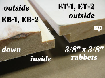 Step 7. Cut 3/8” x 3/8” rabbets along one 15-3/16” edge of each of the parts ET-1, ET-2, EB-1, and EB-2. Glue ET-1 and EB-1 together. Glue ET-2 and EB-2 together. You now have two panels 15-3/16” x 17-1/2” which are the side walls. Attach them to the assembly you made in Step 6, on screws only, no glue (this way you can later remove this wall to connect two boxes together to make a 14-frame hive). The box is ready.