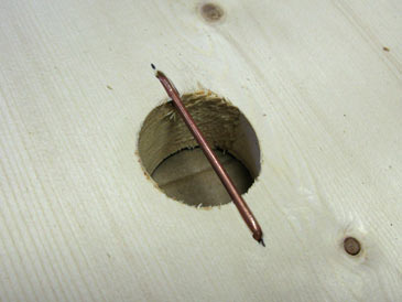 Step 4. Flip part F over. The rabbet is now facing up. Trim hive staples to 1/2” leg length and drive them over the middle of each entrance hole, oriented top-bottom. This prevents bird entry (it’s a bee house, not a bird house). If you don’t have hive staples, take a 2-1/2” nail, bend 1/2” of the sharp end at the right angle, then drive it in the same position as the hive staple, with the head of the nail pointing down.