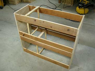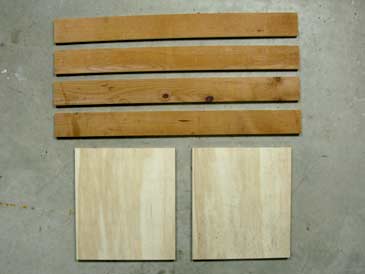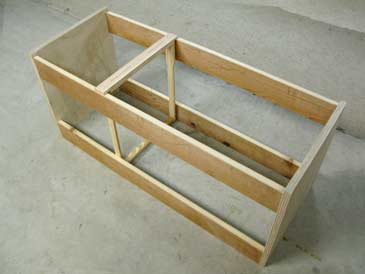 Step 1. Position the two plywood panels upright (with the narrow side on the floor). Clamp two boards between the plywood, 1/2” lower than the top of the plywood. Pre-drill and assemble on two screws per corner.