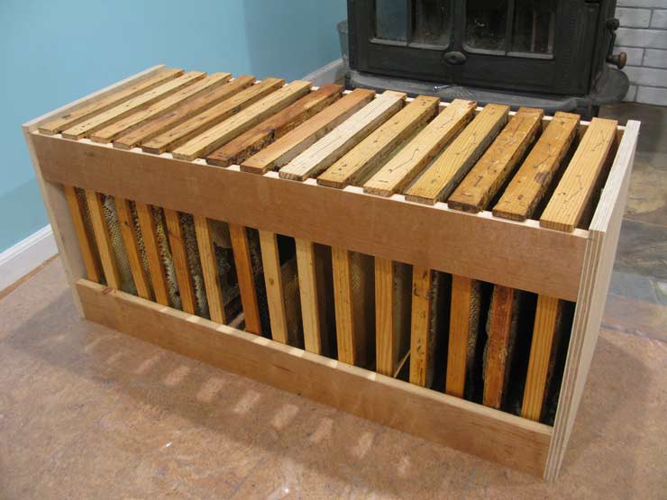 This rack can hold 20 to 22 frames. You can make it shorter or longer to fit your needs. You can also add handles if necessary. Note that this rack is not intended for carrying frames full of honey (it would be close to 200 lb); but one person can comfortably handle a load of extracted frames. We freeze extracted frames (outside, during cold nights) prior to storing to prevent wax moth / small hive beetle damage.