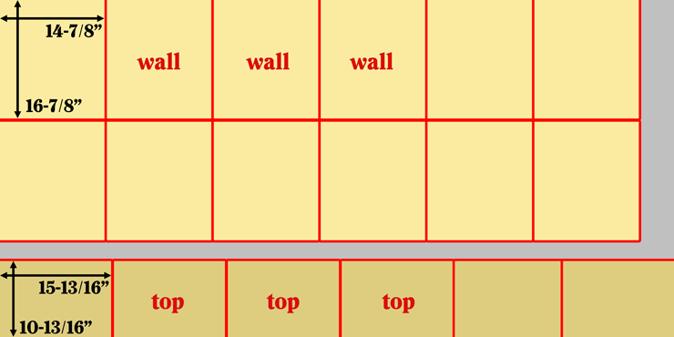 Step 3. Cut the 3/8” plywood as shown. You’ll have twelve front/back walls 14-7/8” x 16-7/8” and six tops 15-13/16” x 10-13/16”.