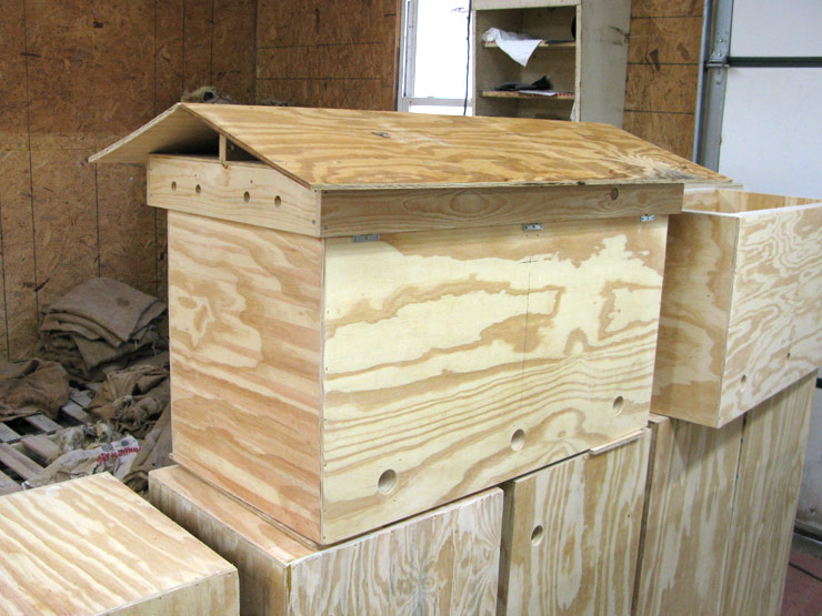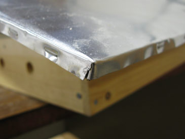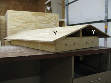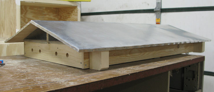You will notice that this roof has no insulation in it. This is because in Layens hive design, the space above the top bars is left open for ventilation during the summer, and filled with insulation (e.g., a wool-filled pillow) for the winter months. See details in Keeping Bees in Horizontal Hives.