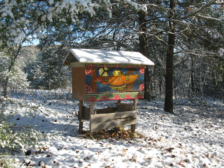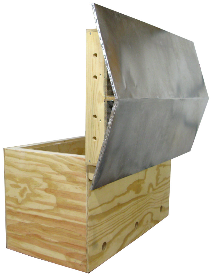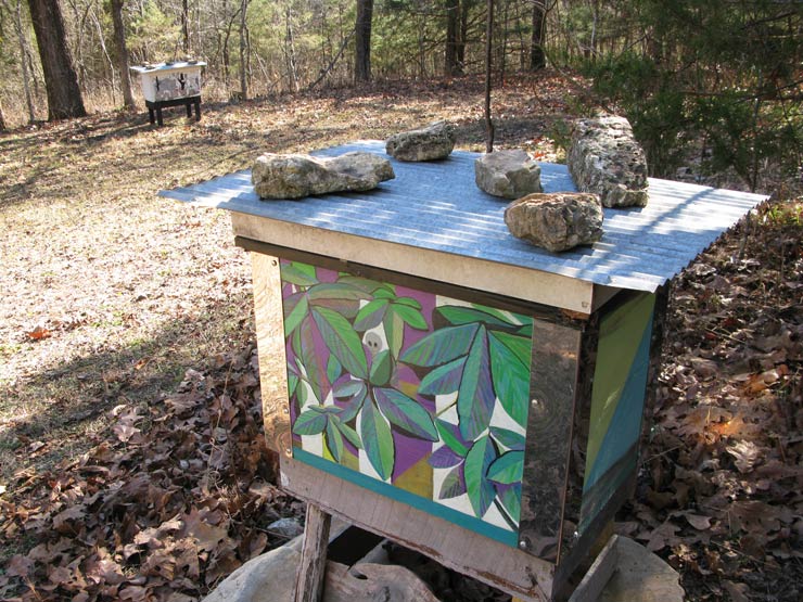 Peaked roofs on horizontal hives don’t just look pretty — they are functional. The overhang sheds water away from the hive walls, greatly extending their life, and shades the hive box during the hottest hours of the day. The ventilated attic space helps with temperature regulation, preventing overheating even in the hottest of summers. If your hive is decorated with fanciful designs, the peaked roof (also called gable roof) prolongs the life of the painting.