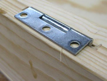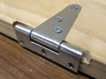 Step 8. Install the three hinges in the recesses you prepared in Step 3. Predrill screw holes 1/2” deep with a 1/16” bit and attach with #6 3/4” wood screws included with the hinges.