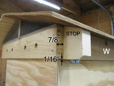 Step 13. Make two STOP blocks that prevent the lid from opening too far and damaging the hinges. Start with a 3-15/16” x 2-1/2” block 1-1/2” thick. Trim one end down to 3-3/16” (that’s 17°). Then cut off 5/16” at 45° from the other corner, for good looks. Position it under the roof 7/8” from the ends of the hinged W. Predrill and attach with two 2-1/2” screws from the inside (going through W into STOP) and with one 1-5/8” screw through Y into STOP. This stopper should fit snugly against W and Y, and will protrude 1/16” past the lower edge of W.