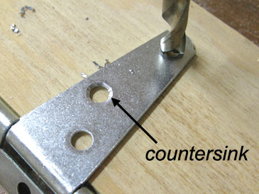 Step 7. Using a 1/4” drill bit for metal, drill countersinks in the “legs” of the three hinges, on the side opposite the factory-made countersinks. (Countersink is the small bevel for the screw head to be flush with the surface.) Go at very slow speed — don’t cut all the way through!