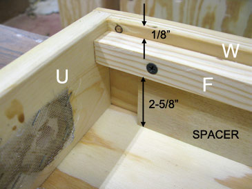 Step 5. Place U into the rabbets in W, square, predrill and attach with glue and 1-5/8” deck screws, two per corner.