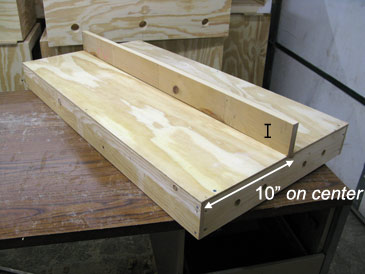 Step 10. Position I upright along the center of XZ (10” on center from the edge of the short side). Make sure I is square to XZ, predrill the ends of I at 45° and attach I through XZ into U with one 1-5/8” screw per end, driven at an angle.