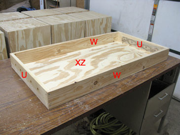 Step 6. Attach XZ to the U-W frame. Make sure the recesses for the hinges are along the W edge away from XZ. Use glue and 1” staples or other fasteners.