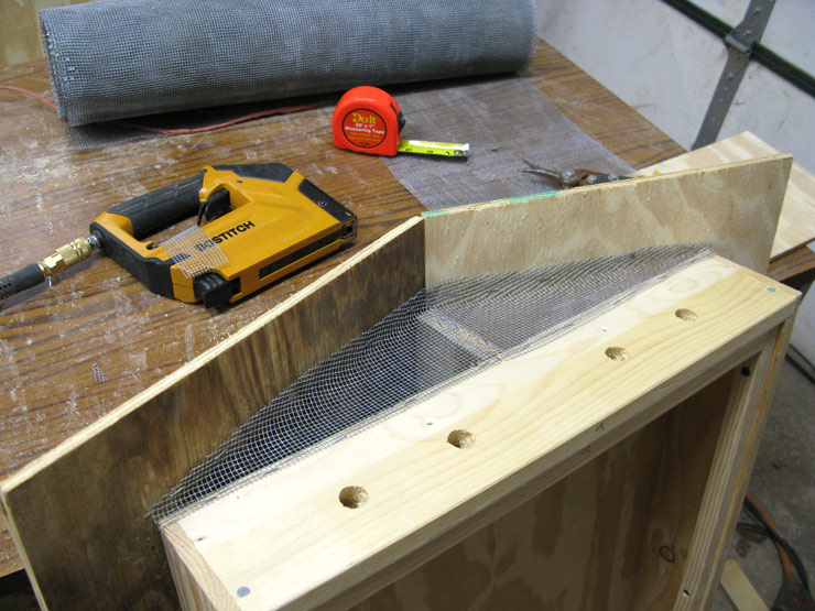 Step 4. Mark the edge of U that will be outside and bottom once assembled into a lid. Drill four 5/8” holes in each U: 1-3/8” on-center from the bottom edge of U and 3” and 6” from each butt end. Drill at and incline so it sheds water. On the other (inside) side of U, cover the openings with metal insect screen V (four 2” x 4” pieces) and staple into place.