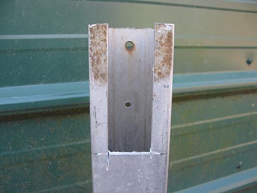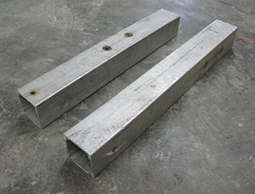 Step 2: Legs. I used a 2-3/4” square aluminum post that was lying around. (If I had no post, I would have used a 1-1/2” x 1-1/2” steel angle at least 1/4” thick, or 1-1/2” steel U-channel.) In one wall, I cut a 1-1/2” x 4-5/8” slot and drilled two holes for screws in the opposite wall. Flip the bed upside down and attach each leg with two 2-7/8” structural screws such as HeadLOK. I made the base leg 20” long, of which 4-5/8” overlays the wood (net height 15-3/8”). I made each leg slightly different length because of my sloping terrain.