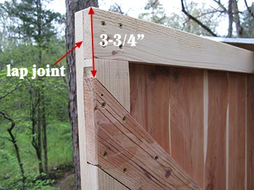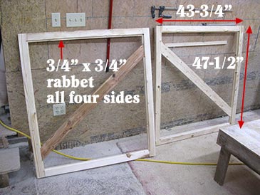 Step 9: Doors. Make two frames 43-3/4” wide x 47-1/2” high. Cut four parts DOOR-H 43-3/4” x 2-7/16” x 1-1/2” and four parts DOOR-V 47-1/2” x 2-7/16” x 1-1/2”. Make lap joints: at each end of each board cut a rabbet 2-7/16” wide x 3/4” deep (half the board thickness), glue and screw to make the frame. Add a diagonal brace DOOR-B 60” x 3-1/2” x 3/4” embedding it into the frame 3-3/4” from the corner — connect with glue and screws, trim flush with the frame. Cut a 3/4” x 3/4” rabbet around the perimeter of the frame and fill with tongue-and-groove paneling (glue and staple 42-1/2” boards in place with 1-1/4” narrow crown staples). After glue sets attach to the bee bed with three door hinges per side. The top of the door overlaps R2 by 1/2” and swings open clear of the edge of the roof. I additionally attached a 88” x 2-5/8” x 1-1/2” board (TRIM-L) under doors to help support their weight. Similar trim was attached to the remaining three sides for good looks: TRIM-S 30” long on short sides and TRIM-L 88” long on the long side under the window.