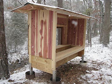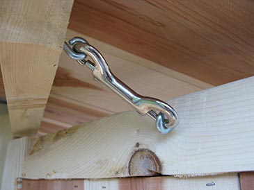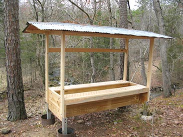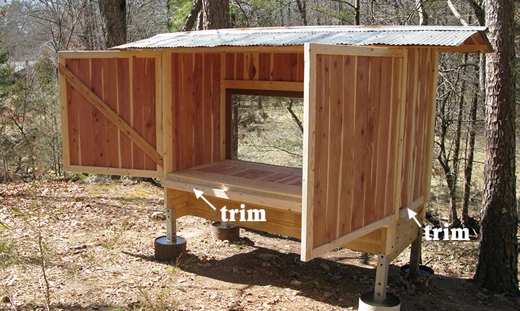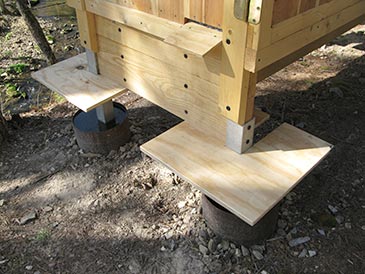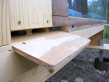 Step 10: Final touches. Four skirts (3/4” plywood 20” x 20”) wrap around the legs so bees don’t fall into the water containers. They are attached with 1-5/8” deck screws to the body of the bee bed from below. • Landing boards made of 3/8” plywood slanting 15° are attached under the entrances with 1-1/4” exterior screws: 6 3/4” x 5” for side-wall entrances, and 10” x 5” for front-wall entrances. • Metallic insect screen covers gable ends under the roof, stapled in place with 1/2” T50 staples. • Weather strips (threshold) is attached between the doors to prevent insect entry. • Carabiner and eye screws hold the door in open position so it does not flap in the wind when you work the hives. • Door latches and handles to taste.