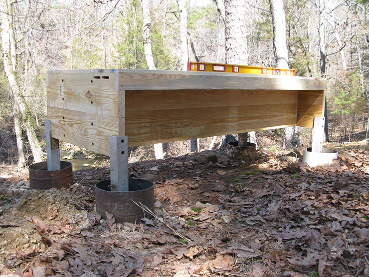 Step 3: Install in place. Have four people carry the bed and lower the legs into the four containers you prepared in Step 1. Check with a level. Fine-tune by adding some gravel under the legs. If your legs and your containers are different metals (mine are steel and aluminum), add rocks or gravel under the legs so they don’t touch the container, to prevent corrosion.