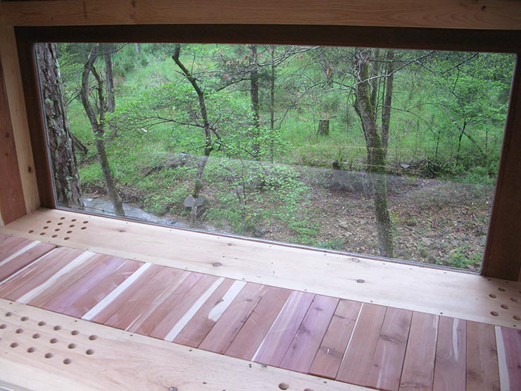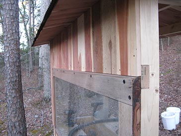 Step 8: Window and siding. I reused an old French door for window (76-7/16” x 34-1/4” x 1-9/16”), predrilling and attaching it with six 2-7/8” structural screws to W, five to E (see bee bed plans) and four to S1. The rest of the three walls was covered with tongue and groove boards attached with 1-5/8” exterior screws. Siding boards run vertically: top end is attached to the boards X1, X2, and R1, and bottom end to the body of the bee bed, notching around the entrances. If you have no window, you’ll use boards 50-1/4” tall throughout; width may vary; you need a total of 30” wide for each of the side walls and a total of 88” wide for the front wall if there’s no window. The window is optional; modify your framing in earlier steps if you have no window or if it is sized differently.