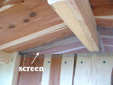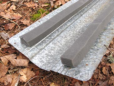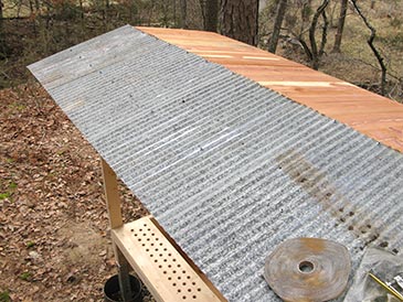 Step 7: Roofing material. I used reclaimed barn tin: 10 panels 30” long and 26” wide. Attach with metal roofing screws to beams; put butyl tape where panels overlap. Attach universal foam closure to the ridge cap; attach the ridge cap with metal roofing “stitch” (7/8”) screws. Cut off any screw tips protruding under the roof boards. Seal any holes in used roofing with roofing silicone.