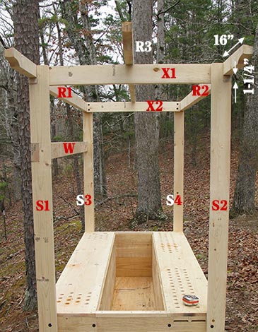 Step 5: Top framework. Cut two 1-1/2” x 3-1/2” x 34” (X1 and X2) and connect to the top of S1-S2 and S3-S4, on the inside, with two 2-7/8” structural screws. Take three beams 1-1/2” x 3-1/2” x 10’ (R1, R2, R3). Notch both ends of R2 16” x 1-1/4”. Insert R1 into the notches of S1-S3, and R2 into the notches of S2-S4 (projecting 16” on each side), attach with two 3” deck screws per connection. Position R3 over the center of X1 and X2 (projecting 16” on each side), attach with a 3” deck screw at an angle. I shaped the ends of these beams for good looks; this is optional. Finally, attach a 1-1/2” x 3-1/2” x 88” board W inside the lower notches of S1 and S3 if you have the same window as mine (see Step 8).