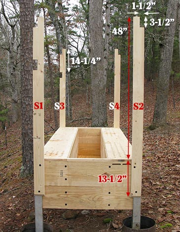 Step 4: Studs. Cut four 1-1/2” x 3-1/2” x 61-1/2” studs (S1 through S4), notch one end 3-1/2” x 1-1/2” to receive the beams. Position along bed’s edge so 48” of the stud is above the bed surface (13-1/2” stud overlap with end wall). Attach with two 2-7/8” structural screws (HeadLOK), notches facing outside. I cut additional 3-1/2” x 1-1/2” notches in S1 and S3, 14-1/4” down from the top end, to attach a window (Step 8).