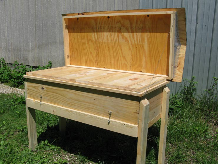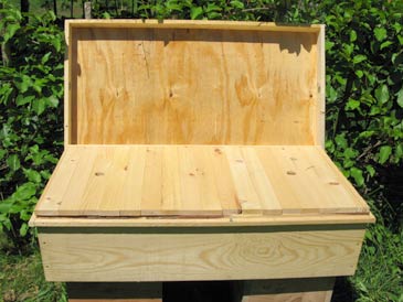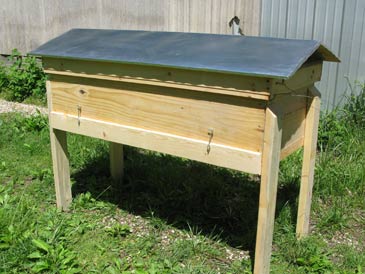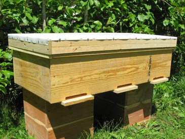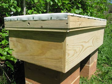 The hive top has a 3-1/2” rim (made from “one-by-four”) and 3/4” diameter screened vents on both ends, centered. It is covered with aluminum flashing or, better still, white aluminum trim coil (to avoid glare). This top allows for some 2” above the cover boards, being propped up by the ledge running around the hive box.