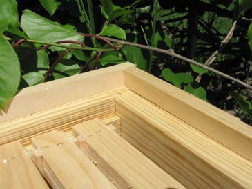 The ledge is made of 3/4” square bars running along the perimeter 1/2” down from the edge. Two sticks 21-3/8” long; two sticks 49-5/16”. The top can be attached on hinges. Exactly the same principles apply to building a ventilated gable (peaked) hive roof with a layer of cover boards underneath. Enjoy!