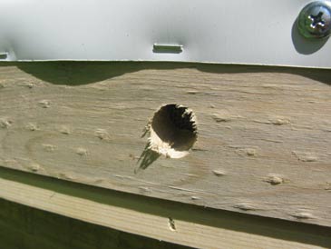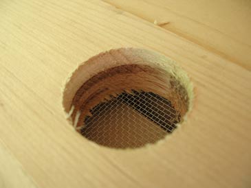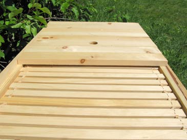 The cover boards are ripped from “one-by” stock. I like making them about 2-5/8” wide. Do not make them too wide: they will warp. (This is because the space under the boards is more humid than the space above them.) Two of the boards have ventilation holes in the middle: 1-1/2” diameter, covered with metallic insect screen stapled into place from the bottom side. I place these vented cover boards towards each end of the box. Use insect screen to cover these openings (not 1/8” wire mesh, which will let small hive beetles and other vermin pass through it).