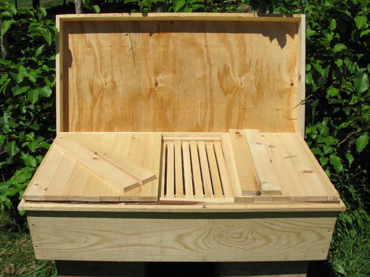 In warm and hot climates a ventilated hive top (“Layens-style”) is preferable to the insulated one. So we can improve the Long Langstroth hive design by including a layer of cover boards and a ventilated top that leaves 2” of air space above the cover boards.